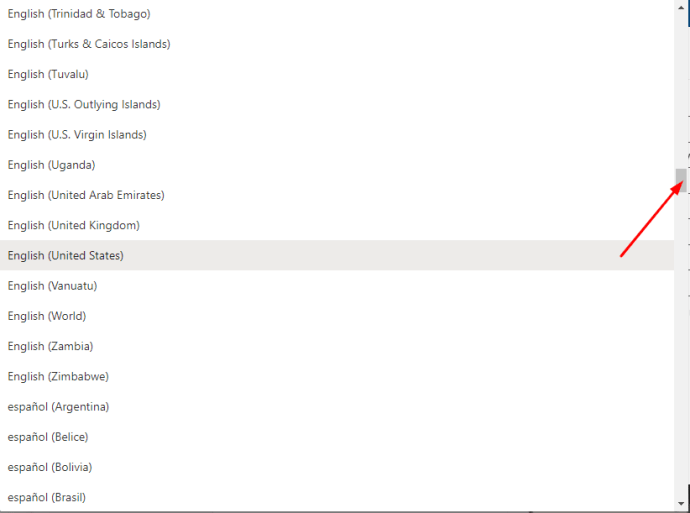 Explore las opciones en el cuadro emergente y seleccione el idioma que desea usar para su cuenta de Outlook. Puede desplazarse hacia abajo para ver todas las opciones, no solo las que se muestran en la pantalla.