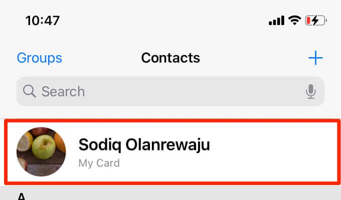 También puede acceder a su tarjeta de contacto en la aplicación Teléfono. Abra la aplicación Teléfono, vaya a la Contactos pestaña y toca la Mi tarjeta etiqueta ubicada en la parte superior.