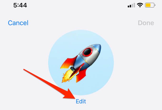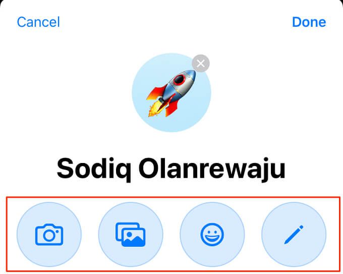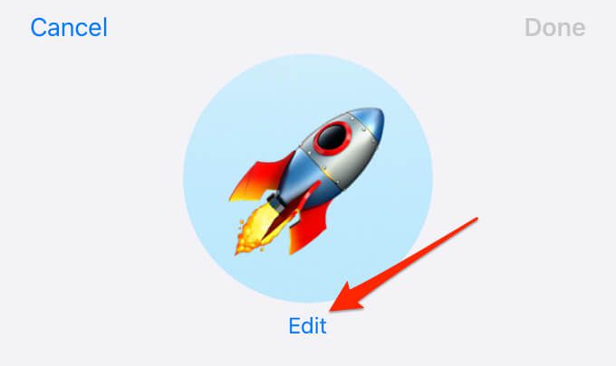 - toque en icono de cámara para tomar una foto o seleccionar el icono de imagen para usar una foto preexistente en su biblioteca como la imagen de ID de Apple. Alternativamente, toque el botón emoji de cara feliz para elegir un emoji preferido desde el teclado emoji de su iPhone o iPad. Finalmente, el icono de lápiz le permite usar textos personalizados o iniciales como su imagen.