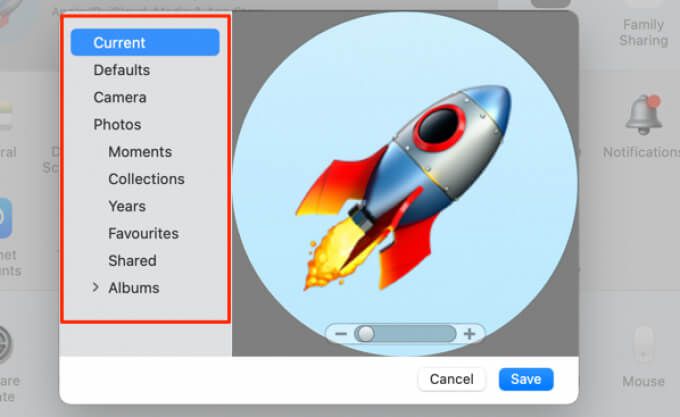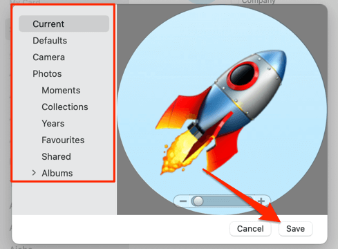 - Seleccione su foto de las categorías o use la opción Cámara para tomar una foto con la cámara web de su Mac.