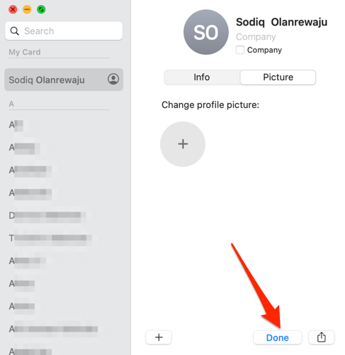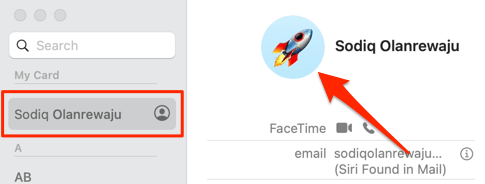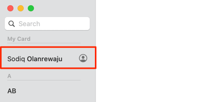- Vaya a la parte superior de la lista de contactos en la barra lateral izquierda y seleccione el nombre de su cuenta en la sección «Mi tarjeta».