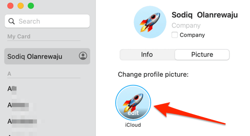 - Seleccione su tarjeta de contacto en la barra lateral izquierda y haga clic en el icono de imagen de perfil.