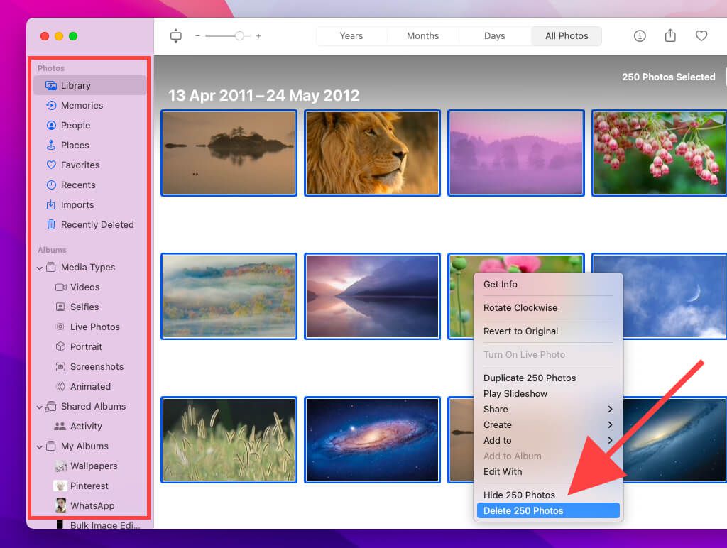 Si usa Fotos de iCloud, cualquier cambio que realice en la aplicación Fotos en su Mac también se reflejará en su iPhone. Por lo tanto, puede seleccionar varias imágenes arrastrando el cursor o haciendo clic en ellas mientras mantiene presionada la tecla Dominio llave. Luego haga clic derecho y seleccione borrar fotos.