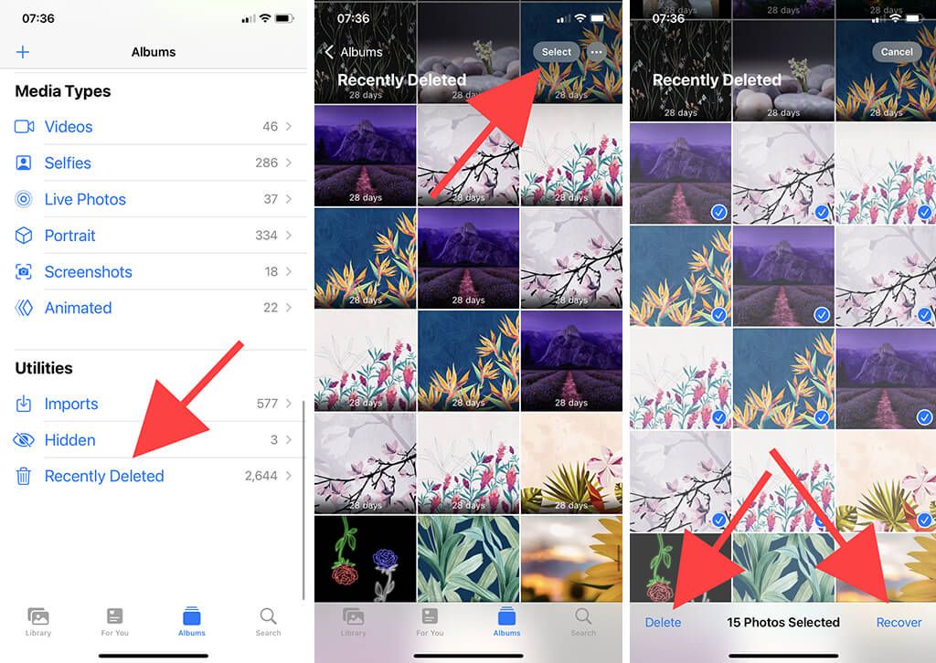 3. Toque Seleccione y elige las fotos que deseas eliminar o recuperar.