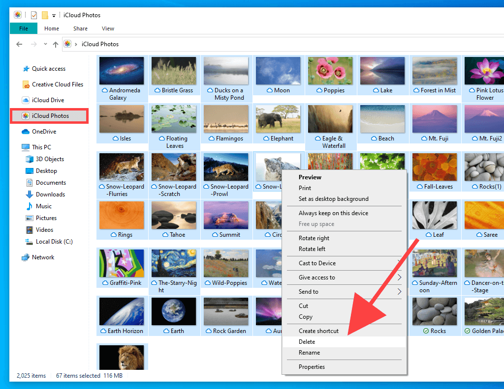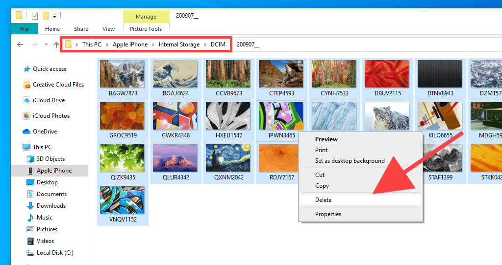 Si usa Fotos de iCloud, probablemente tenga iCloud para Windows configurado en su PC. Simplemente seleccione Fotos de iCloud en la barra lateral del Explorador de archivos y elija las fotos que no desea arrastrando el cursor sobre las miniaturas o haciendo clic mientras mantiene presionado Al control. Luego haga clic con el botón derecho en cualquier elemento resaltado y seleccione Borrar.