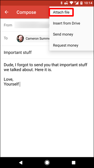 Una vez que haya dicho todo lo que necesita decir, toque el pequeño icono de clip en la esquina superior derecha. Se abrirá un nuevo menú que ofrece algunas opciones: Adjuntar un archivo, Insertar desde Drive, Enviar dinero y Solicitar dinero. Toca la primera opción.