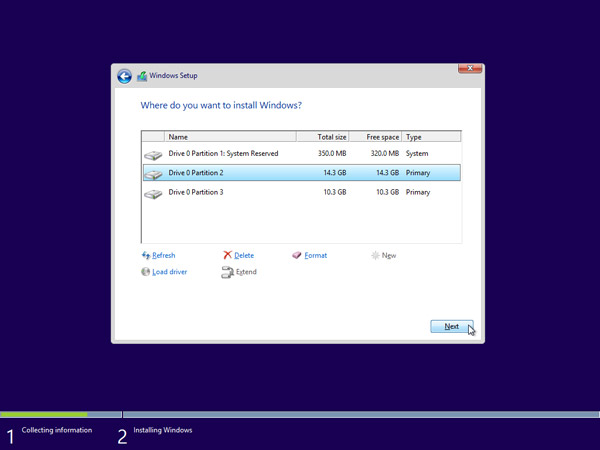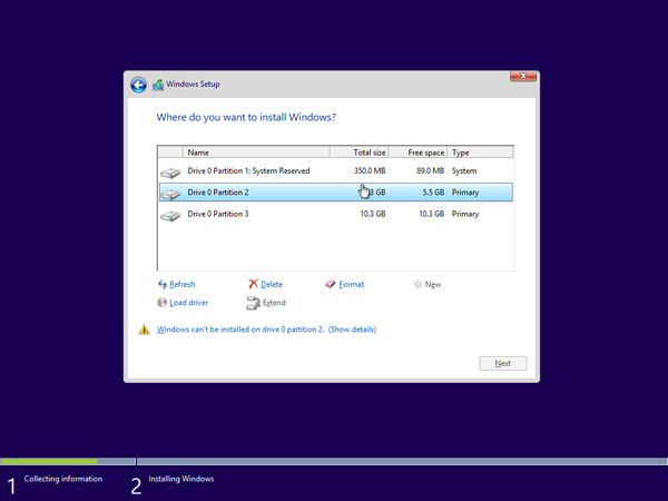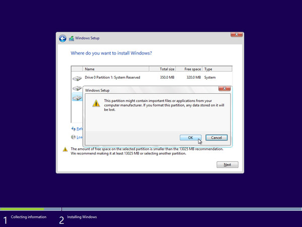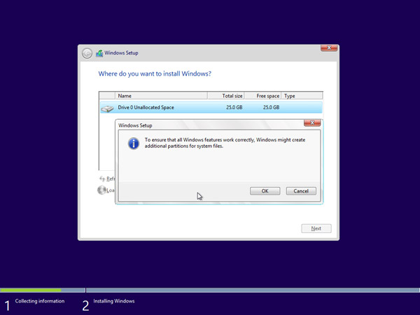 12. Windows creará otra partición para almacenar los archivos del sistema. Prensa [OK]. Siga el paso 10 para crear particiones para el resto del espacio no asignado si es necesario.