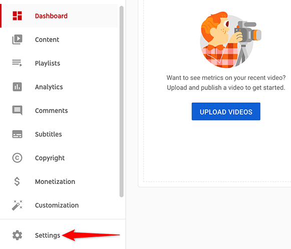 En el sitio web de YouTube Studio, en la barra lateral izquierda, haga clic en «Configuración».