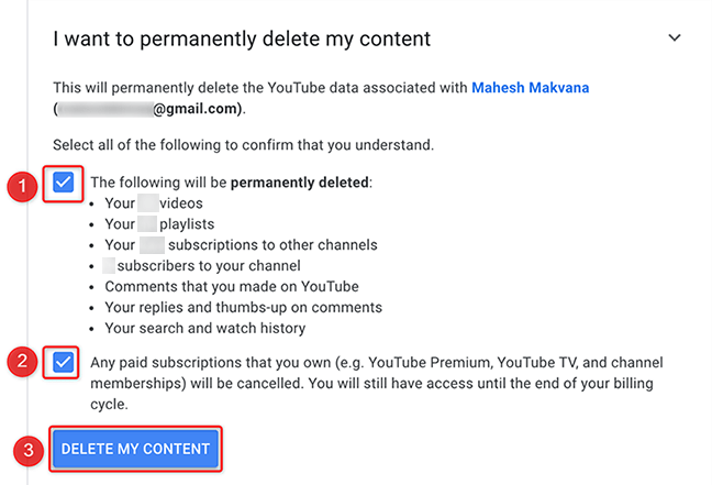 Advertencia: Asegúrate de que YouTube elimine todos los datos asociados con tu canal. No puede restaurar sus datos una vez que se eliminan.